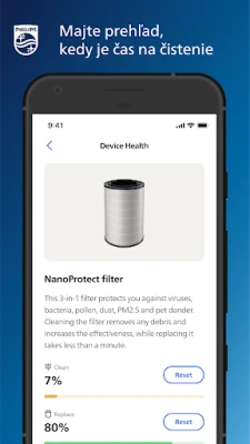 Majte svoje prostredie plne pod palcom vďaka integrovanému diaľkovému ovládaniu v Air+. Nastavujte režimy, rýchlosti ventilátorov a ďalšie funkcie zariadenia jednoducho, odkiaľkoľvek. Aplikácia Air+ tiež zabezpečuje bezproblémovú údržbu: včas vás upozorní na potrebu čistenia alebo výmeny súčiastok a ponúka podrobné pokyny, dokonca aj možnosť objednať nové filtre priamo z aplikácie. Získajte komplexný prehľad s aktuálnymi dátami o vonkajšej kvalite vzduchu a počasí až pre päť vybraných lokalít. Okrem toho, Air+ rozširuje svoje možnosti aj na inteligentné riadenie robotických vysávačov Philips.